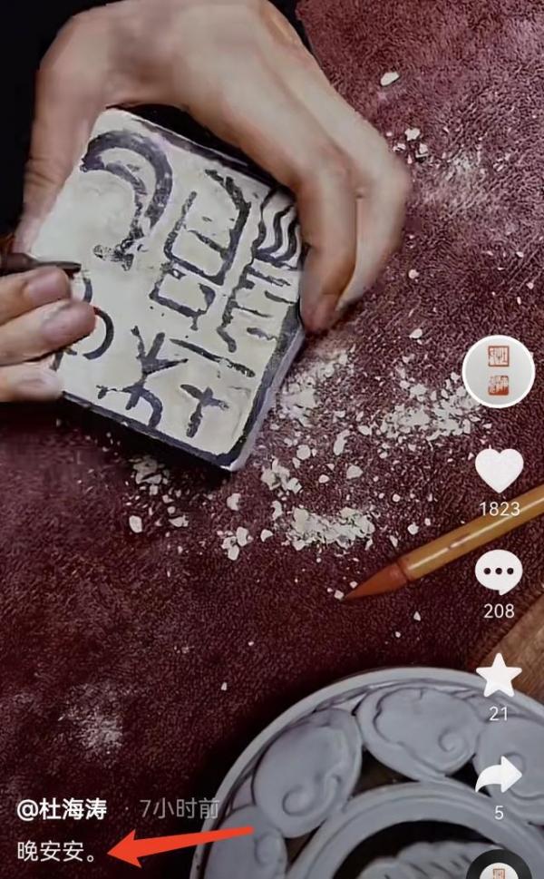 视频记录了一个雨天,杜海涛来到一个作坊里亲自雕刻印章的画面。