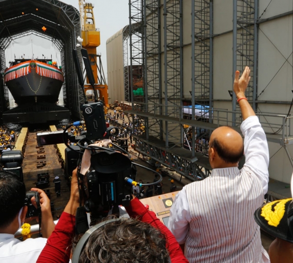 印度国防部长拉杰纳特·辛格在主持下水仪式,图自拉杰纳特·辛格推特账号(下同)