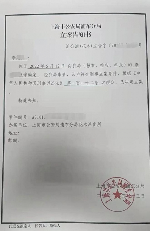 事发后,朱先生立即向上海市公安局浦东分局花木派出所报案,目前警方已立案调查。