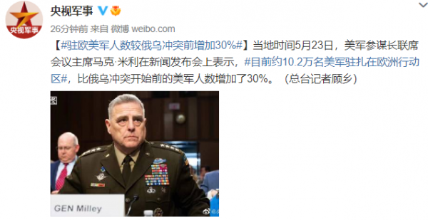 当地时间5月23日,美军参谋长联席会议主席马克·米利在新闻发布会上表示,目前约10.2万名美军驻扎在欧洲行动区,比俄乌冲突开始前的美军人数增加了30%。