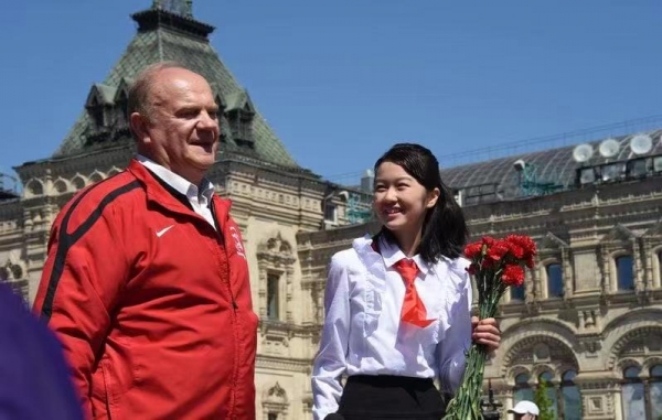 庆祝活动现场,俄联邦共产党中央委员会主席久加诺夫,以及俄共产党、共青团、战争和劳动荣誉代表为新少先队员系上红领巾。