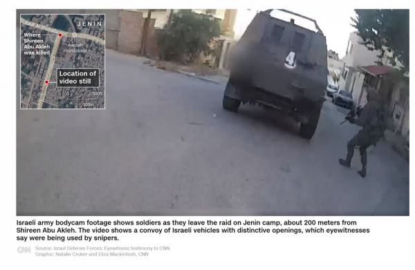 在视频中,可以看到五辆以色列车辆在阿克利赫被杀的同一条路上排成一列,这些车辆位于阿克利赫南200米处。离记者最近的那辆车印着白色的数字"1",离记者最远的那辆车印着数字"5",两辆车都垂直地横过街道。在车辆的后部,数字的正上方,有几个射击口。几名目击者告诉CNN,在枪击开始前,他们看到狙击步枪从车内伸出,但在此之前没有任何其他枪声。