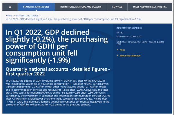 (观察者网讯)法国国家统计与经济研究所(INSEE)5月31日发布的一份报告显示,2022年第一季度,法国国内生产总值(GDP)环比下降0.2%,这一数字低于此前该机构估计的0%,也加剧了人们对法国经济滞胀的担忧。