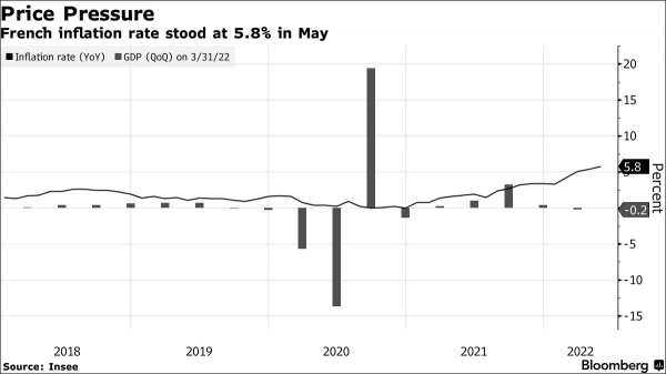与此同时,据彭博社报道,法国5月份的的消费者价格指数(CPI)比一年前跃升了5.8%,通胀水平达到历史最高值,彭博社分析,这是因为能源和食品成本的飙升继续渗透到了其他商品和服务中。而今年第一季度GDP出现萎缩,更加剧了人们对法国经济陷入滞胀的担忧。