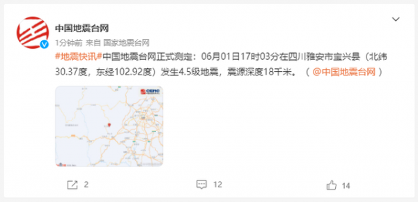 6月1日17时00分在四川雅安市芦山县(北纬30.37度,东经102.94度)发生6.1级地震,震源深度17千米。