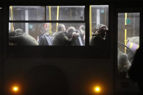5月20日,载着乌克兰武装人员的巴士抵达俄军控制的奥列尼夫卡镇。新华社发(维克托摄)