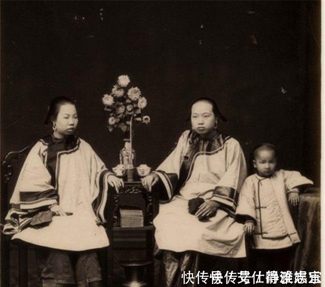 晚清两位妇人与小孩罕见合影,三寸金莲是常态,面容严谨。