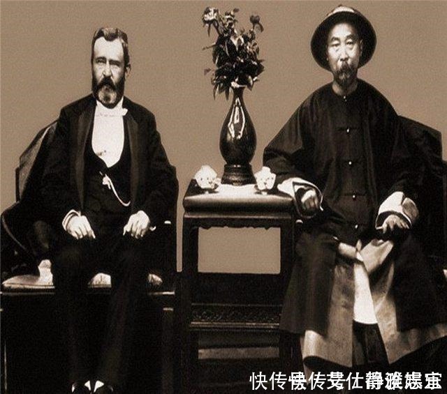 1879年,李鸿章邀请美国前总统尤利西斯.格兰特访问中国罕见合影,李鸿章官威十足,服饰和坐姿与格兰特形成鲜明对比。
