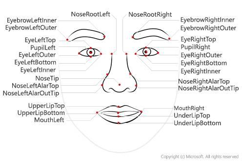 微软的页面上显示可以通过人的 27 个面部标志进行识别,可以判断的面部属性也多种多样,比如给定的面部是否模糊、是否有配饰、估计性别和年龄、是否佩戴眼镜、头发的类型、是否有戴眼镜、是否有微笑的表情 ……