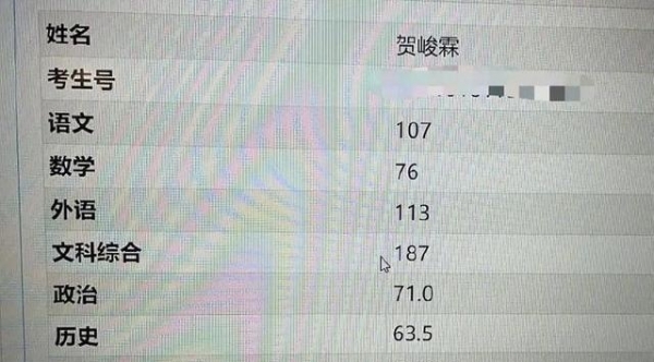 有网友曝光了一张疑似贺峻霖的成绩单,语文107、数学76、英语113、文科综合187、政治71、历史63、地理52。对于普通人来说,这样的分数并不高,但贺峻霖是特长生,能够拿到438分已经很不错了。