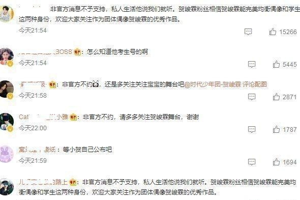 贺峻霖的粉丝直言,非官宣不予支持,还是等小贺自己公布吧!也有人提出质疑,贺峻霖的成绩怎么会被人查到的,其实很简单,明星的身份证并不是秘密,只需要花一点钱,你的个人信息都能够扒出来,更何况是高考成绩呢?