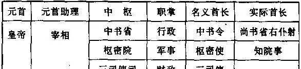 这个表只列出中枢三个机构,另外"尚书省"、"门下省"、"九寺",跟唐政府组织一样,仍然存在,不过都属于辅枢,地位并不重要。中枢三机构并不总隶于宰相,而是分隶于皇帝。 宰相只在理论上统摄全局,但除非奉有特别命令,否则他不能过问枢密院(军事)或三司使司(财政)的事。