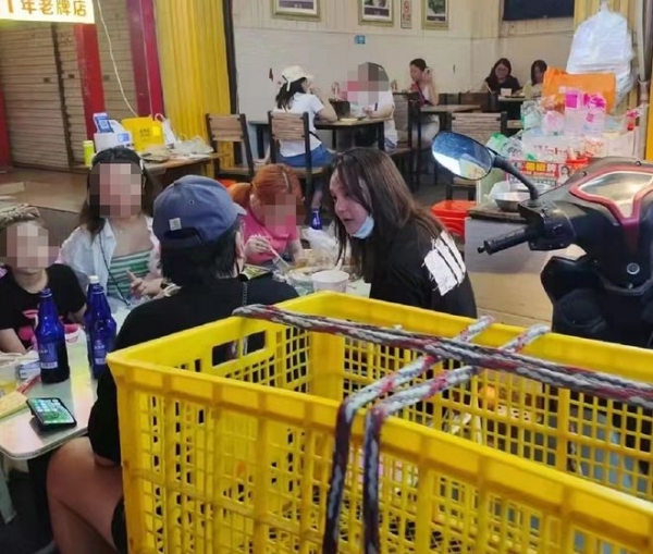 从照片里可以很明显地看出尹正一行人在一家大排档内,周围环境简陋,他们就坐在路边吃饭,相当随意。