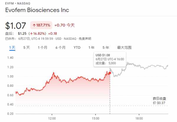据Markets Insider 28日报道,美国新型避孕凝胶生产商Evofem Biosciences的股价周一(27日)暴涨187.71%,延续了24日美国最高法院推翻"罗伊诉韦德案"的裁决之后开始的飙升,两个交易日累计上涨约240%。
