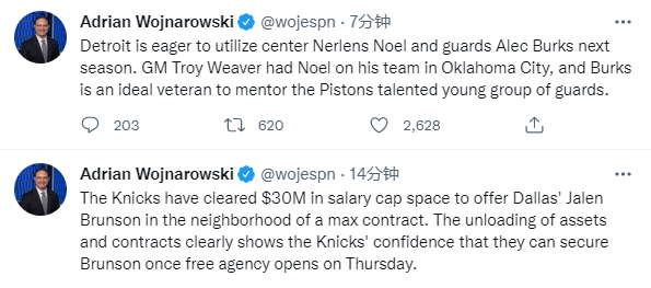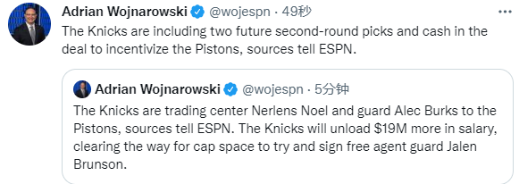 北京时间6月29日,纽约尼克斯又促成一笔交易,据espn名记沃纳罗斯基报道,尼克斯把诺埃尔和伯克斯交易到活塞,并且送出两个未来次轮签(2023年和2024年次轮签)和600万美元现金,创造3000万美元的薪资空间,旨在签约独行侠二当家布伦森。