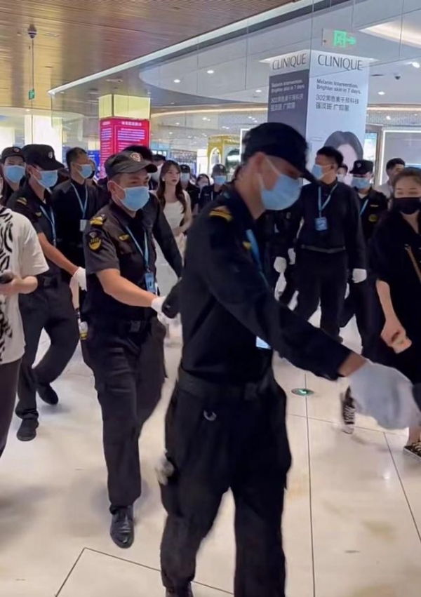 保安将前面的路人驱赶之后,后面就是一条长龙,一条通道全部是几十名保安手牵手围成城墙,程潇的工作人员走在前方,戴着口罩,走路带风的节奏,程潇就走中两侧保安的中间,就像"重量级人物"一样,给人一种生人勿进的感觉,排场特别的大。