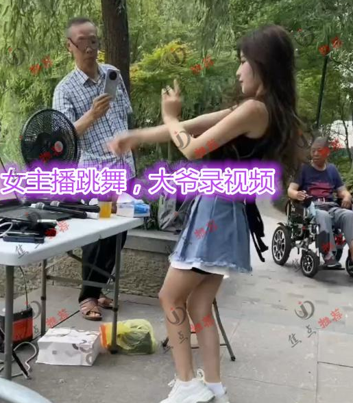 另一名大爷举着手机录像,发朋友圈炫耀自己的录像技术,而一名大爷坐着轮椅欣赏,女主播则在镜头前卖力地表演,这个公园的一角,成了这几个人的舞台,大爷们欣赏着年轻美女的舞蹈,而美女也因为大爷的存在,吸引了不少粉丝,各有所得,互相成就。