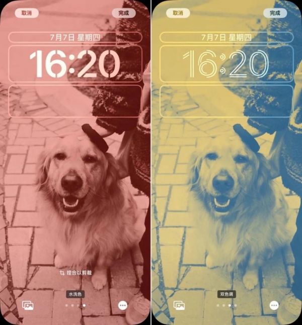 首先,锁屏壁纸新增了两种滤镜,分别为双色调和水洗色,效果可以参考下图。
