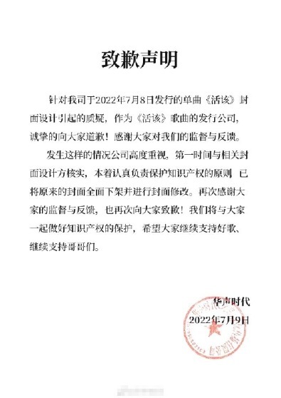 7月9日,华声时代针对《活该》封面设计引起的质疑道歉,已将原来的封面全面下架并进行封面修改。