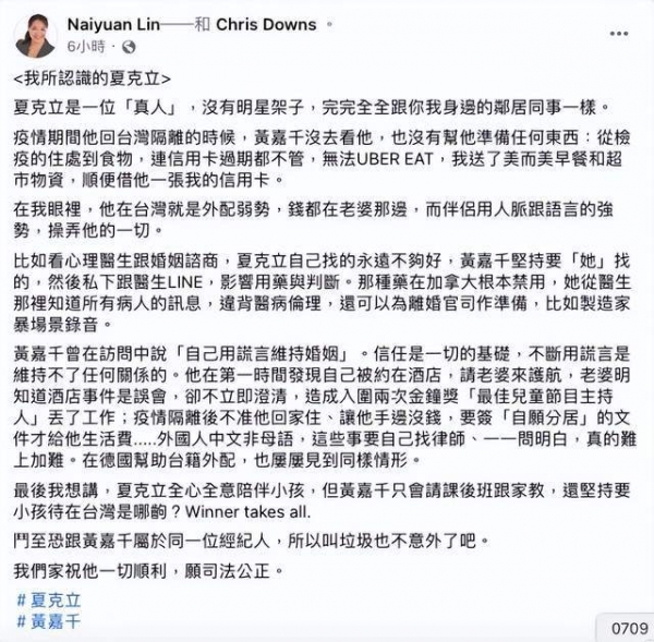 夏克立本人没有对离婚一事发表意见,但朋友Naiyuan Lin却为他发声,指控黄嘉千"五大罪状",包括:经济能力悬殊、婚姻咨商强势、不帮忙澄清绯闻、疫情期间冷暴力、不照顾小孩等等。