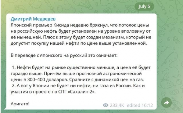 梅德韦杰夫表示,从日语翻译成俄语,这意味着"市场上的石油将大大减少,其价格将大幅提高","这比预测的300-400美元天文价格还要高。请大家将这一天价与天然气价格的变化进行比较。日本将不会得到俄罗斯的石油或天然气,就像其不会参与'萨哈林2号'液化天然气项目一样。"