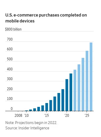 另一个有利因素是,在线支付比以往任何时候更容易了。现在,商家可以使用许多一键支付和结帐服务,而且随时都有新的付款方式出现。Insider Intelligence的数据显示,2021年,大约40%的购物是通过移动设备完成的。而在10年前,这个数字是7%。