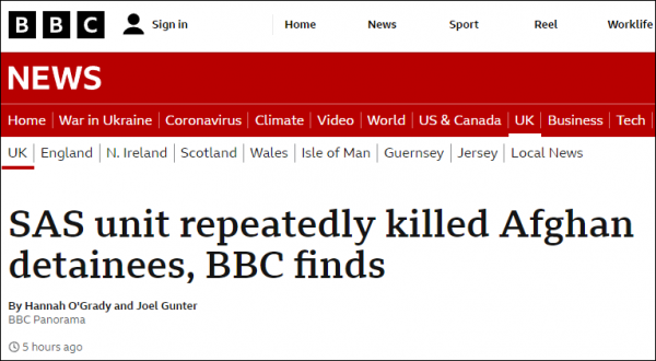 BBC在研究军方报告、往来邮件、现场弹孔照片等证据后的最新调查报告显示,在阿富汗的英国特种空勤团(SAS)成员多次在可疑的情况下杀害被拘押者和手无寸铁的人,甚至各中队间还存在比拼"谁杀的人更多"的情况。其中一支部队可能在为期6个月的轮驻期间非法杀害了54人。
