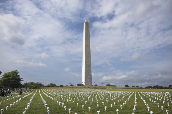 上月7日,美国华盛顿家广场上摆放装有鲜花的花瓶纪念枪支暴力的死难者 IC Photo图