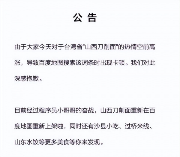 由于大家今天对于台湾省"山西刀削面"的热情空前高涨,导致百度地图搜索该词条时出现卡顿。我们对此深感抱歉。