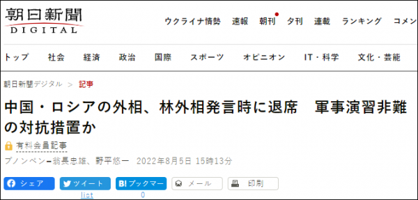 《朝日新闻》解读认为,这是抗议包括日本在内的七国集团(G7)国家和欧盟在佩洛西窜台后发表所谓涉台声明。