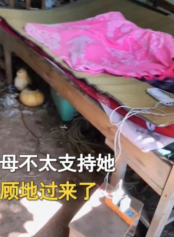 住的地方更是简陋不堪,一张单人木床,上面铺了一张凉席,还有一条粉色的毛毯,床下面,垃圾遍地,生活用品散乱地堆放在一起,简直让人没有下脚的地方。