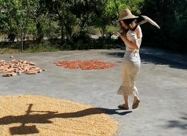 这天,阿娟帮父母晒玉米,穿上了修身的连衣裙,戴着一顶遮阳帽,打扮得美美的,扛着铁锨就来到了院子里。
