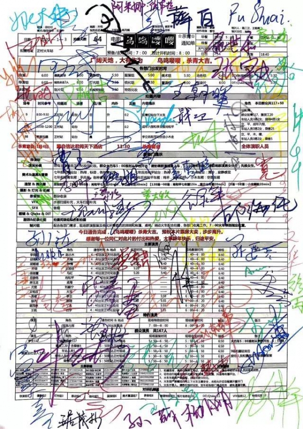 《鸟鸣嘤嘤》剧组成员在通告单上签名留念