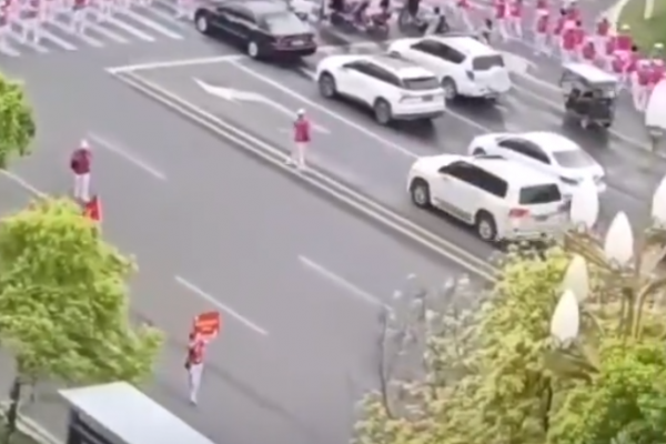 拍摄者孙先生表示,有领头的在路口逼停车辆,当时等了两三个红绿灯,大概两三百人全部走过后才让这些车辆正常行驶。健走队每天都走,领队的身上背着大喇叭,非常大声地放着音乐,特别扰民。之前有市民投诉过,但好两天之后又故态复萌