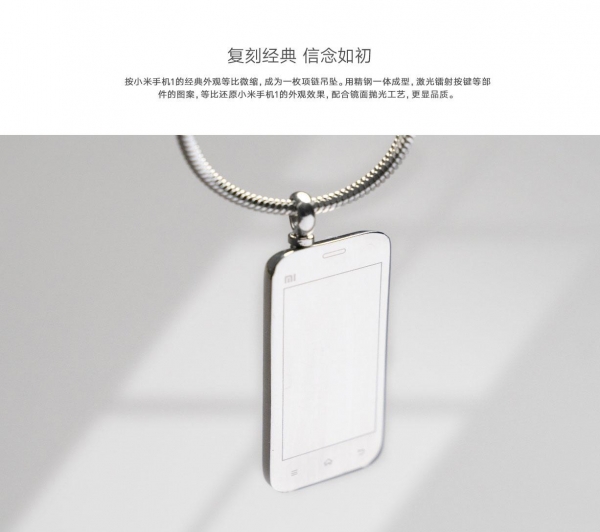 IT之家了解到,据官方介绍,该吊坠按小米手机 1 的经典外观等比微缩,成为一枚项链吊坠。用精钢一体成型,激光镭射按键等部件的图案,等比还原小米手机 1 的外观效果。