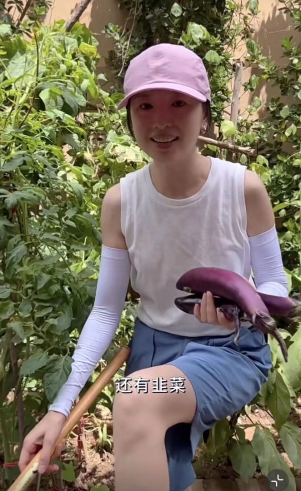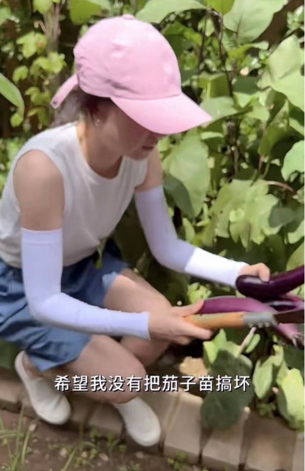 这段时间气温炎热,阳光刺眼,董洁头顶烈日来到菜地中干农活,在阳光的照射下,皮肤白到发光。