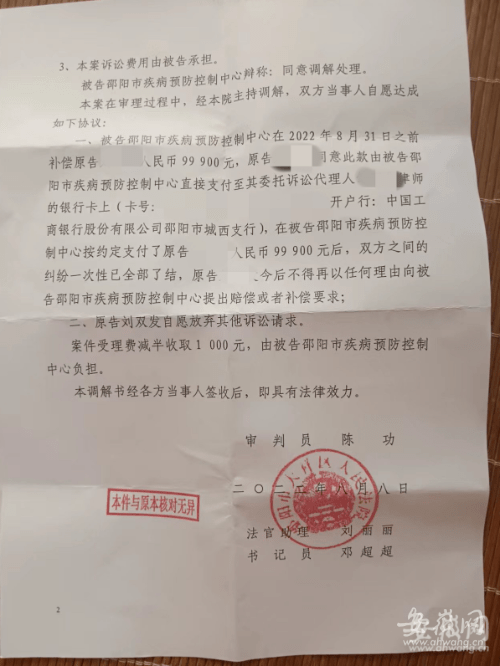 8月27日下午6时许,刚刚结束一天装修临时工工作的刘先生告诉大皖新闻记者,自己确实同意与邵阳市疾病预防控制中心达成和解,钱款前两天已经到账户。