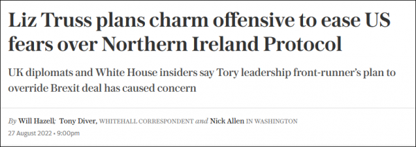 一名前英国高级外交官告诉《每日电讯报》,特拉斯针对"北爱尔兰议定书"的想法对她不利,对她来说很困难,尤其是如果她现在执行这一计划的话。