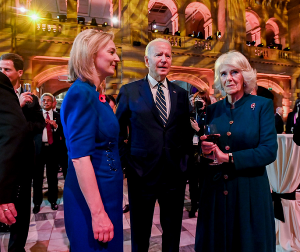 特拉斯(左一)与拜登在去年第26届联合国气候变化大会上合影(社交平台图)