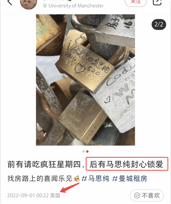 9月1日,就有博主晒出了疑似张哲轩和马思纯的同心锁,该博主的发文地址是英国的曼彻斯特大学。