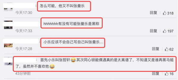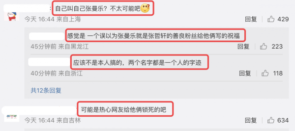 不过也有网友觉得张哲轩不太可能叫自己"张曼乐"吧,因为这是别人给他起的绰号,可能是粉丝以为张哲轩的本名就是张曼乐,给两人挂上去的。更何况两个名字笔迹相同,可能是同一个人写的。
