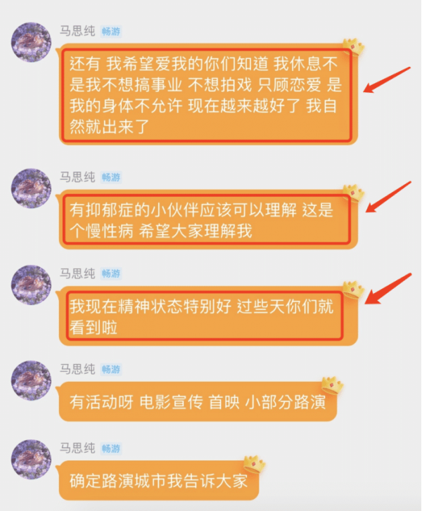 上个月,马思纯为了宣传自己的新电影,首次在粉丝群回应自己的恋情,否认自己是恋爱脑,也并非没有事业心,只是因为患抑郁症一年的时间,身体不允许。