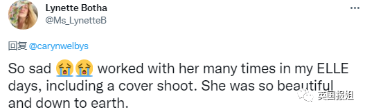 "太难受了。我在《ELLE》杂志工作的时候和她合作了好多次,包括一次封面拍摄。她是那么美,那么接地气的一个人。"