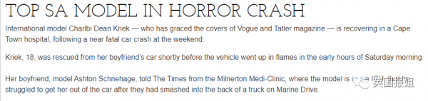 但这场事故对她造成的影响还是巨大的,她在之后暂停了模特事业,大约两年间一边休养一边继续在开普敦戏剧学校的学业。