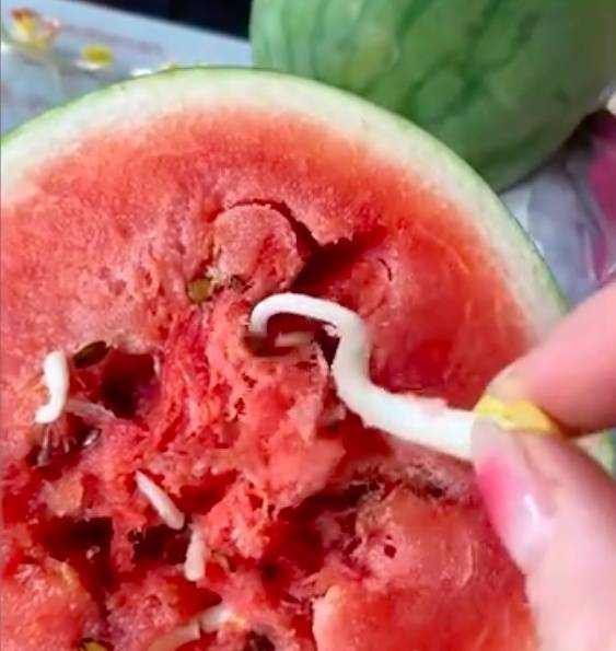 据农民频道报道,高级农艺师李藏朝告诉记者,这其实是西瓜成熟过度后,瓜瓤里的西瓜子发芽。