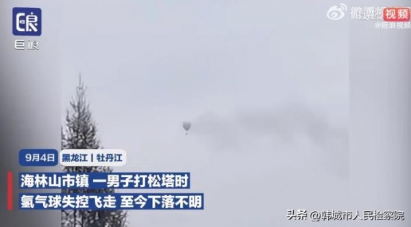9月4日,黑龙江牡丹江海林市山市镇,工人打松塔乘坐氢气球出现事故,一人被氢气球带走飞远,一开始气球上工人用手机在空中录下视频。