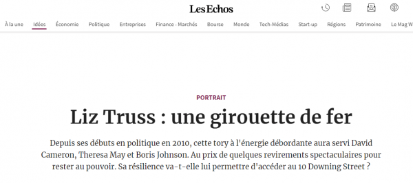 此次特拉斯继任首相后,法国一些媒体评论员厂用"铁公鸡风向标"(法国许多房屋顶上有公鸡形状的风向标)称呼她。报道称,这是讽刺特拉斯当年在脱欧等问题上的态度从坚定的反对者突然变成强硬的支持者。