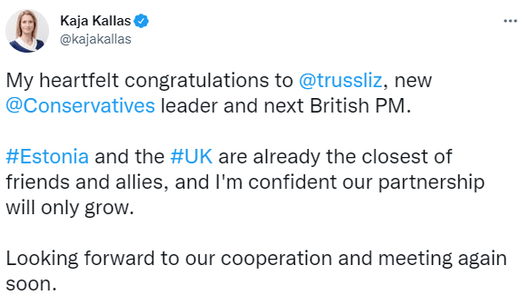 不过,特拉斯对于乌克兰的坚定支持却赢得了一些东欧国家政客们的赞扬。Adler撰文称,他们对特拉斯表现出了"毫无保留的热情"。爱沙尼亚总理Kaja Kallas在推特上发了一张与特拉斯担任外交大臣时的合影,并表示:"我相信我们的伙伴关系只会越来越好。"