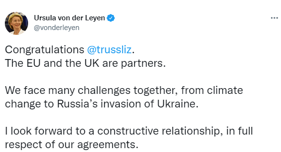 9月5日,欧盟委员会主席冯德莱恩(Ursula von der Leyen)在社交媒体上发文祝贺特拉斯,但补充说,她希望能够与特拉斯建立"建设性关系",并希望她充分尊重双方此前达成的协议。