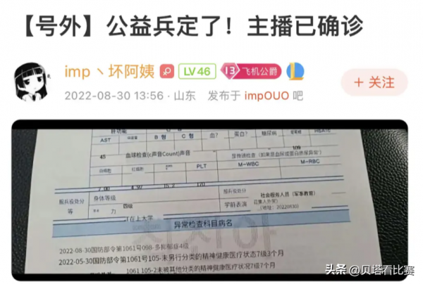 消息来自imp的鱼吧,imp直播间的官方工作人员晒图表示,imp已经确诊了精神病4级,还有抑郁症,需要治疗,因此不用和其他人一样服兵役,只用服公益兵。